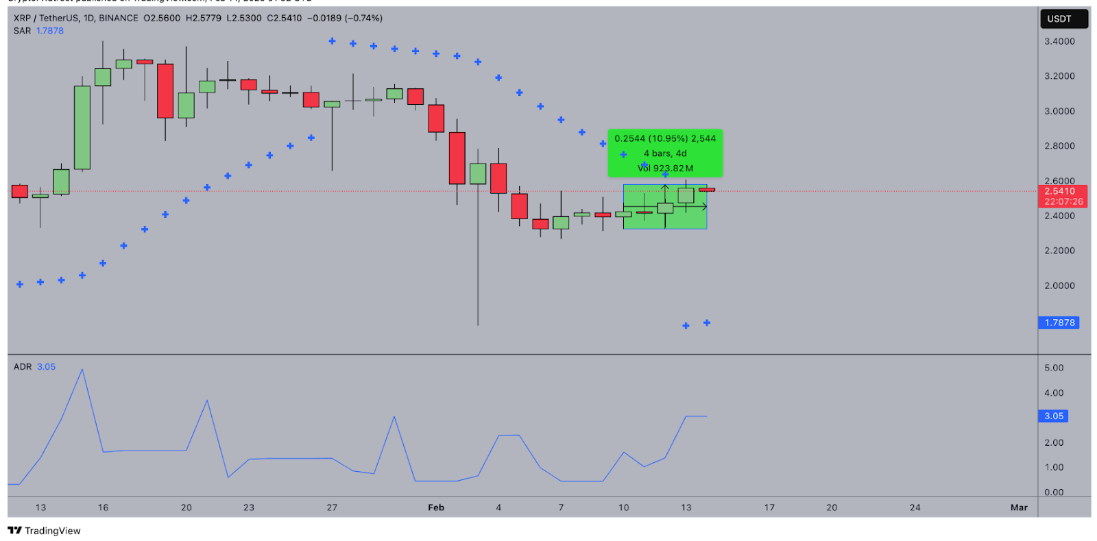 XRP reste en consolidation et se déplace actuellement autour de 2,54 $. Le SAR parabolique implique une pression baissière est présente et continue, mais les dernières tentatives pour inverser montrent les signes d’une réaction haussière. Si le prix dépasse 2,60 $, les Bulls seront en contrôle, le niveau de prix de 2,80 $ étant la barrière la plus importante.