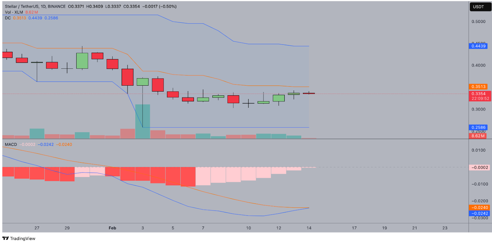 XLM fait face à un niveau de résistance majeur à 0,35 $ tout en augmentant avec un soutien à 0,3354 $. Le canal Donchian suggère qu’il existe une constriction de gamme, caractérisant les modèles de trading confus sur le marché.