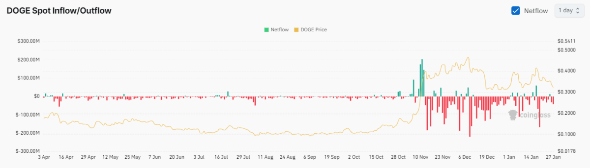 Les tendances fluctuantes ont marqué les mouvements des prix de Dogecoin. Début novembre 2024, a vu des entrées positives nettes dépassant 100 millions de dollars, coïncidant avec un pic des prix d’environ 0,50 $. Cependant, les sorties lourdes en décembre et janvier, dépassant 200 millions de dollars, ont signalé une augmentation de la pression de vente, entraînant le prix inférieur à 0,20 $.