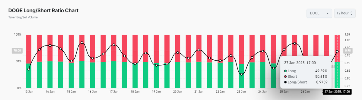 Le tableau des ratios longs / courts met en évidence la lutte continue entre l’optimisme et la prudence sur le marché. Au 27 janvier 2025, Longs a représenté 49,39% du volume d’achat / vente de preneur, tandis que les courts métrages ont légèrement avancé à 50,61%. Cette scission quasi égale reflète un équilibre délicat du sentiment, aucun côté ne dominant.