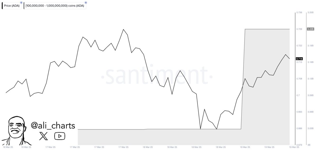 D’un autre côté, l’analyste de crypto Ali Martinez a signalé une activité de baleine significative dans l’écosystème de Cardano. Selon Martinez, de grands investisseurs ont acheté 190 millions de jetons ADA au cours des dernières 24 heures, signalant un intérêt et une confiance croissants dans la crypto-monnaie.