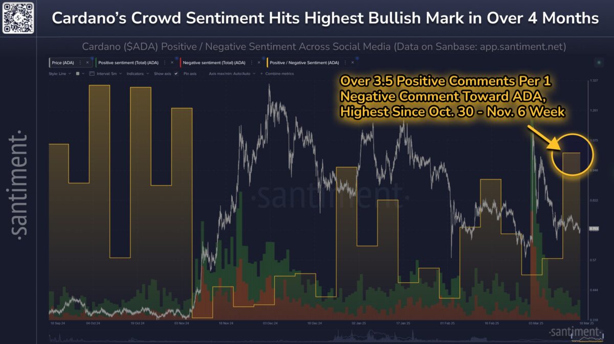 Cette évolution a renforcé la confiance parmi la communauté de Cardano, ce qui entraîne un sentiment haussier à ses niveaux les plus élevés en plus de quatre mois, comme mentionné dans notre article de presse précédent. L’enthousiasme renouvelé reflète un intérêt croissant pour l’ADA en tant qu’acteur clé dans les applications de la blockchain pour la gouvernance et les services publics.