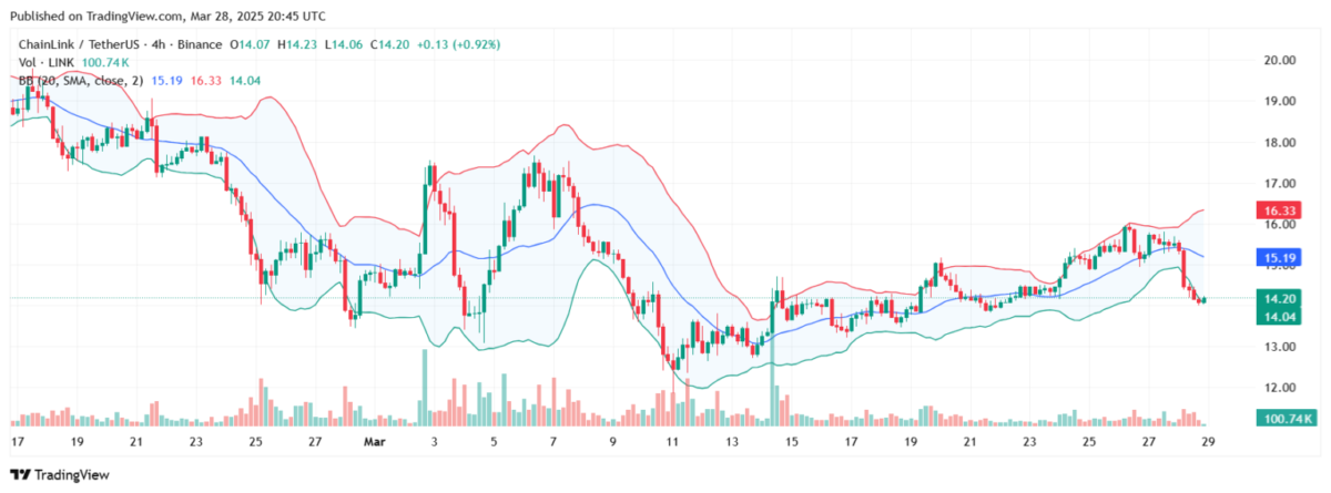 En regardant le graphique Link / USDT 4 heures, l’actif est assis autour de la bande de Bollinger Lower Bollinger à 14,04 $. Ce placement indique une volatilité accrue avec les commerçants pesant si le prix se décomposait ou rebondait vers les niveaux de résistance supérieurs. La déviation de la bande de Bollinger montre des changements de prix extrêmes, créant des spéculations sur le prochain mouvement pour le lien.