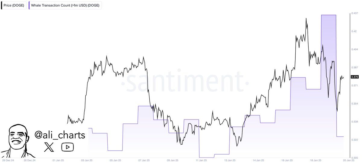 Ali Martinez, analyste de marché mis en évidence un développement intrigant sur X, anciennement Twitter, soulignant que 588 transactions de plus d’un million de dollars avaient eu lieu récemment. Ce niveau d’activité des baleines suggère un fort soutien au Dogecoin malgré les défis du marché, offrant une lueur d’espoir pour un rebond potentiel.