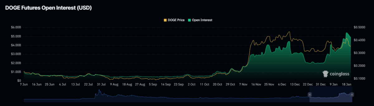 Au moment de la rédaction de cet article, DOGE se négocie à 0,384 $, soit un gain de 7 % au cours des dernières 24 heures. Toutefois, le volume des échanges a connu une baisse de 11,30%, tandis que la capitalisation boursière a atteint 56,7 milliards, avec un gain de 7% au cours de la même période. Les intérêts ouverts ont connu une baisse de 4,5% à 4,84 milliards le 21 janvier, selon CoinGlass.