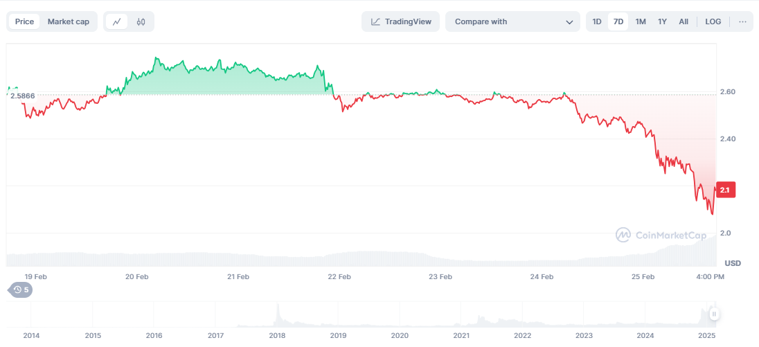 Le prix XRP a atteint son sommet de 3,84 $ en janvier 2018, mais le prix XRP actuel oscille près de 2,1 $ avec une capitalisation boursière de 127,8 milliards de dollars, en baisse de 11,19%. Le prix XRP a vu le volume de négociation 24 heures sur 24 augmenter à 12,71 milliards de dollars, soit un bond de 203,7%. Cette augmentation de la liquidité montre que Ripple reste un acteur actif sur le marché. Malgré cela, la pression réglementaire et la mise au point des investisseurs décalés ont ralenti l’élan, ce qui a incité certains à rechercher de nouvelles opportunités.