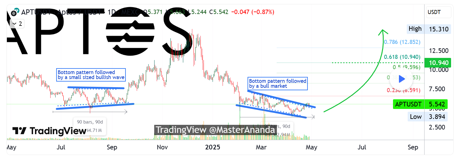 Maître Ananda, un analyste technique connu pour sa persistance dans la lecture de modèles à long terme, a à nouveau attiré l’attention du public. Cette fois, les projecteurs tombent sur Aptos (APT). Selon lui, le marché a montré un modèle de base assez clair. Il a même dit que cette formation est presque identique à celle qui est apparue il y a sept ans – et elle a été suivie d’une croissance massive.