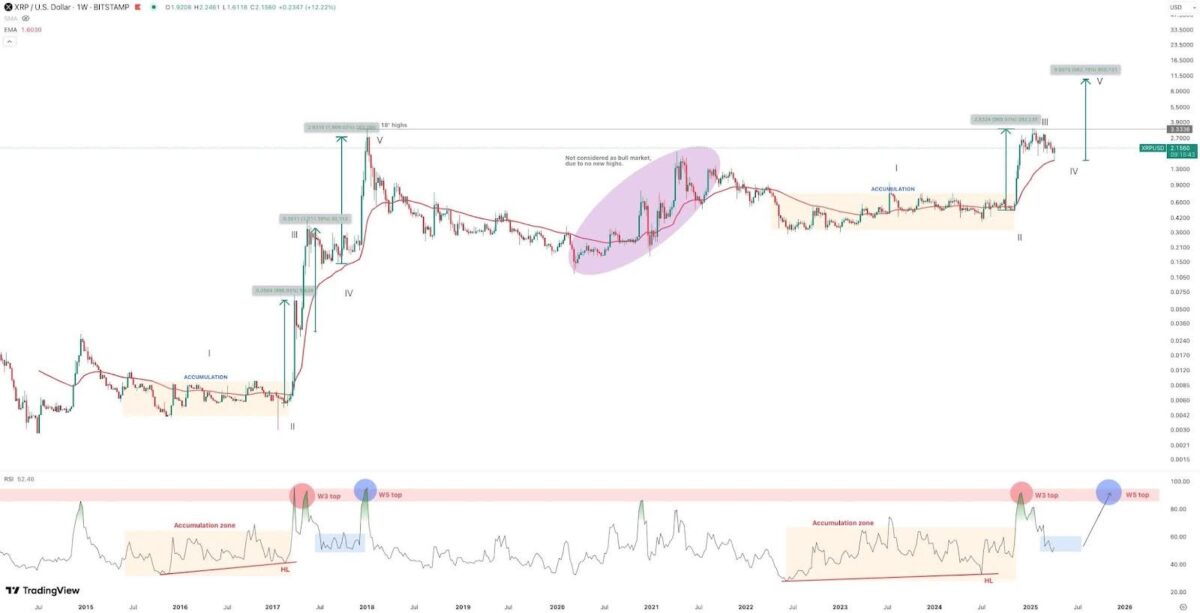 Pendant ce temps, Maelius, analyste technique, rapports Ce récent rebond de XRP de la moyenne mobile exponentielle de 50 semaines (EMA) indique un passage potentiel dans la phase finale d’un modèle d’onde Elliott. Normalement, cette phase, également appelée vague 5, est généralement caractérisée par une très forte évasion haussière. L’une des seconds chances de la montée en œuvre de XRP à un nouveau sommet près de 10 $ est basée sur un éventuel inverse arc-en-ciel qui, selon Maelius, pourrait être jusqu’à 35% susceptible de se produire.