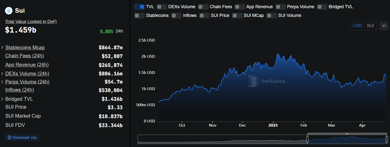 La récente augmentation des prix est également tirée par la poussée des finances décentralisées (DEFI) dans l’écosystème. Lors de la vérification des métriques sur la chaîne sur le réseau, les données Defillama montrent que la valeur totale verrouillée (TVL) sur SUI a augmenté de 10% pour régler à 1,46 milliard de dollars.