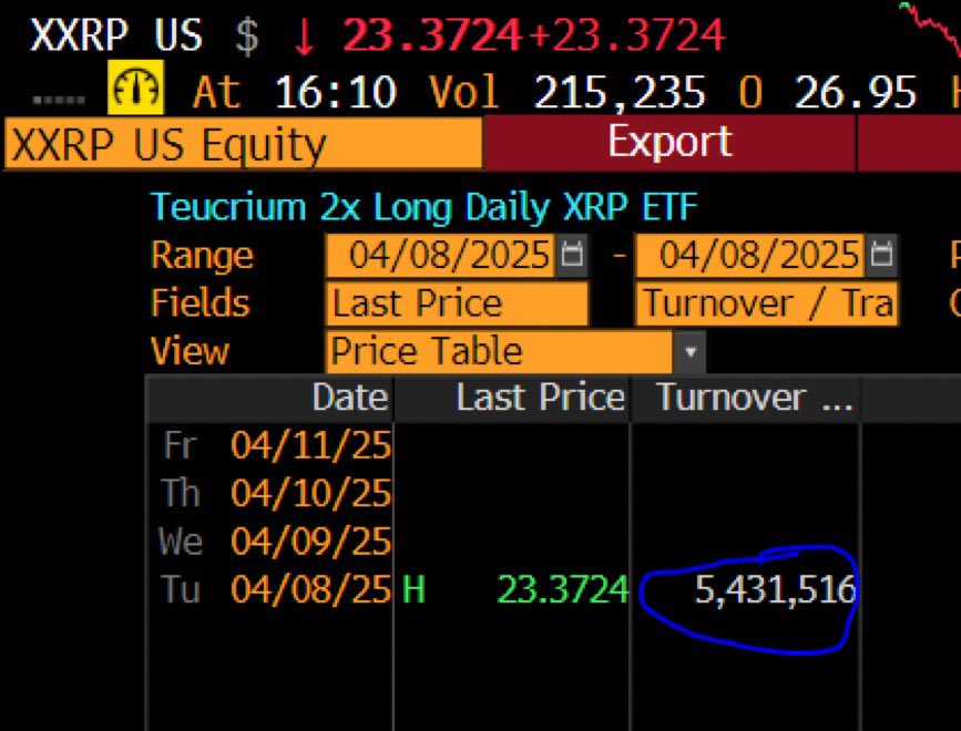 $ Xxrp (2x XRP ETF) a vu 5 millions de dollars de volume le premier jour, très respectable, surtout compte tenu des conditions MKT. Cela le place dans environ 5% des lancements de nouveaux ETF, et environ 4x ce que le 2x ETF Solana $ Solt fait (bien que 200x de moins que King Ibit). pic.twitter.com/u3qqq5yuhv